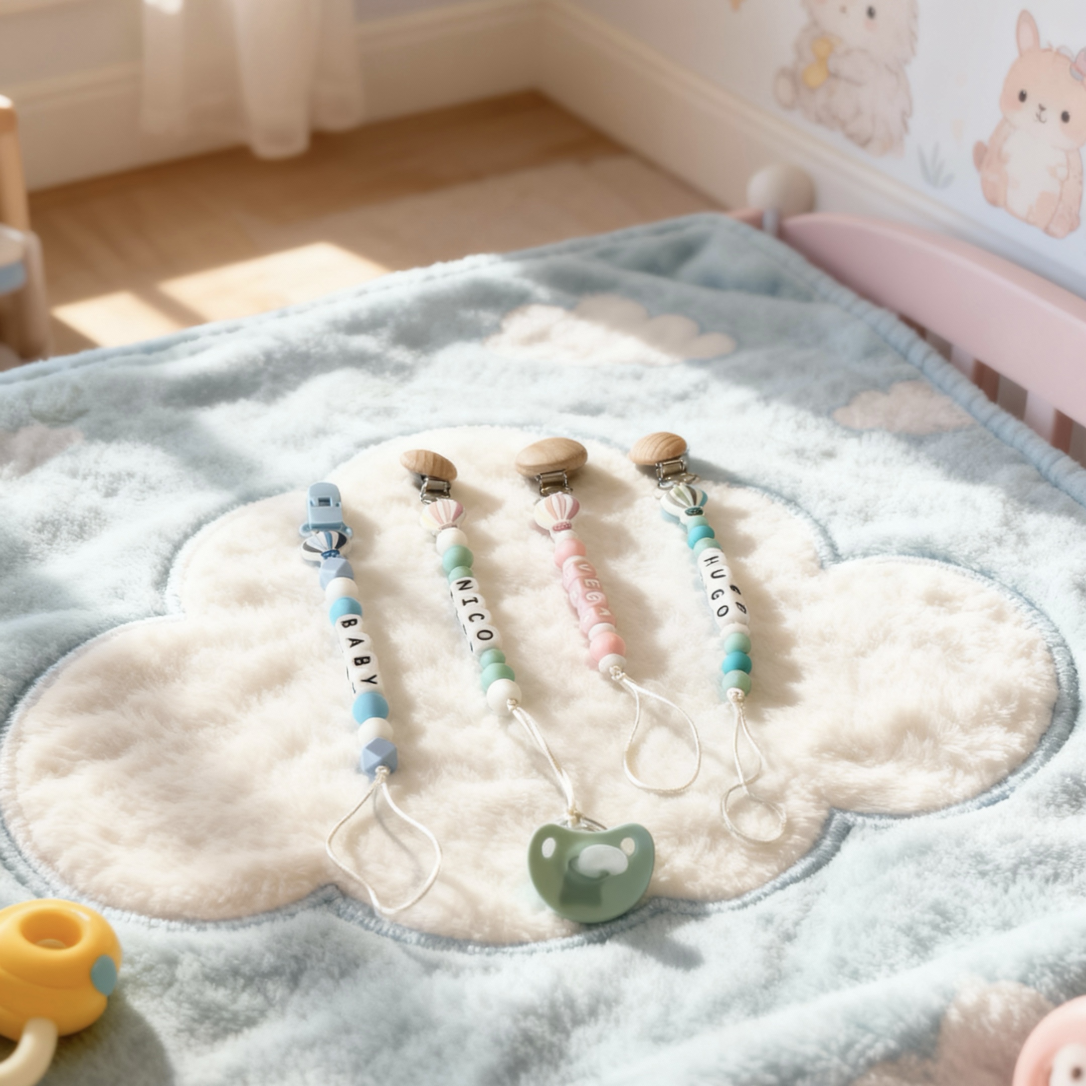 Cada chupetero está personalizado con el nombre que elijas, creando un accesorio exclusivo y especial. Puedes seleccionar entre una amplia gama de colores, combinando tonos suaves, vivos o personalizados.