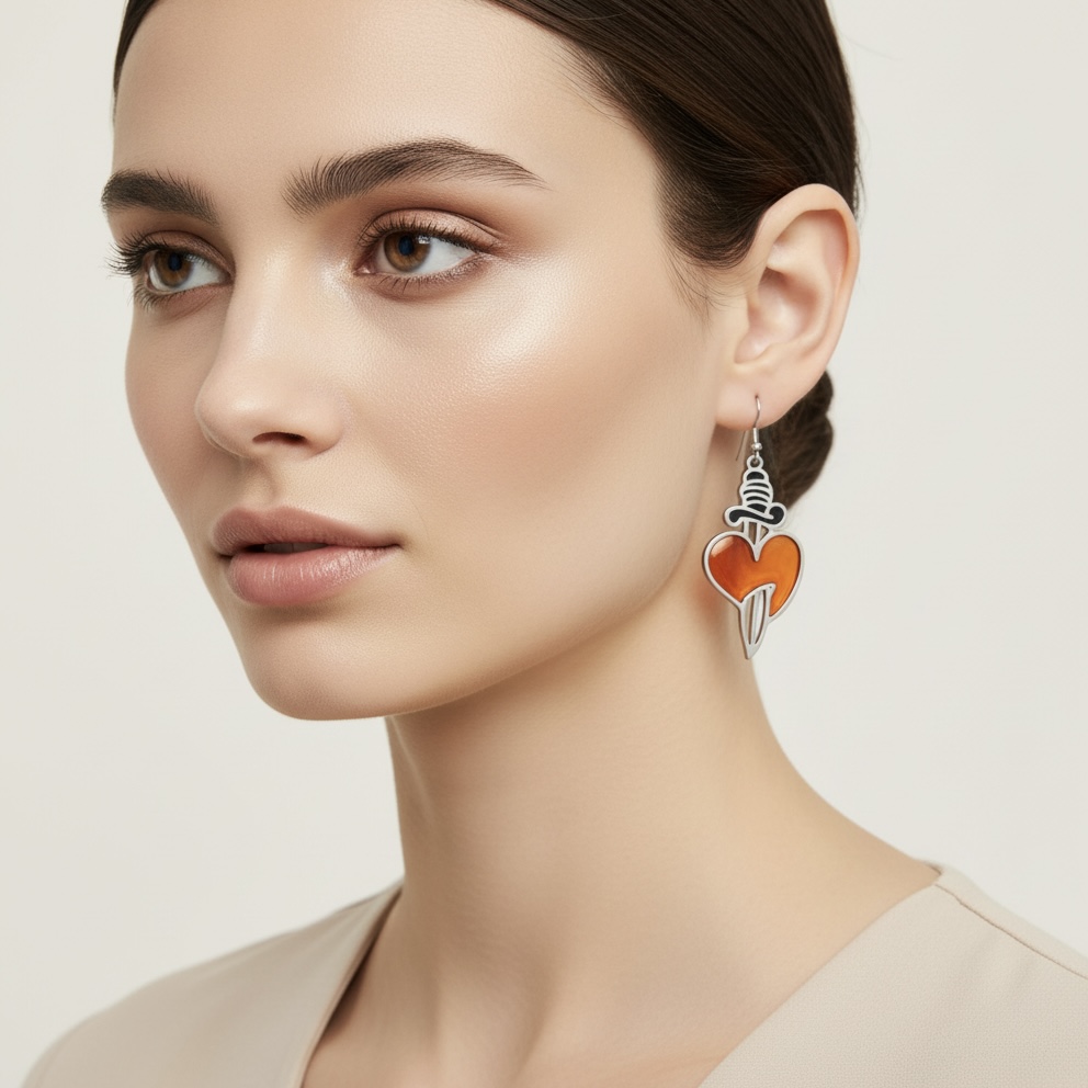 Los Pendientes Valkiria son una declaración de poder y pasión. Con un diseño que presenta un corazón atravesado por una daga, hecho en acero y relleno de resina roja vibrante, estos pendientes representan valentía y amor en su forma más intensa. El dije de acero, combinado con el colgante de plata, crea un equilibrio perfecto entre fuerza y elegancia.
